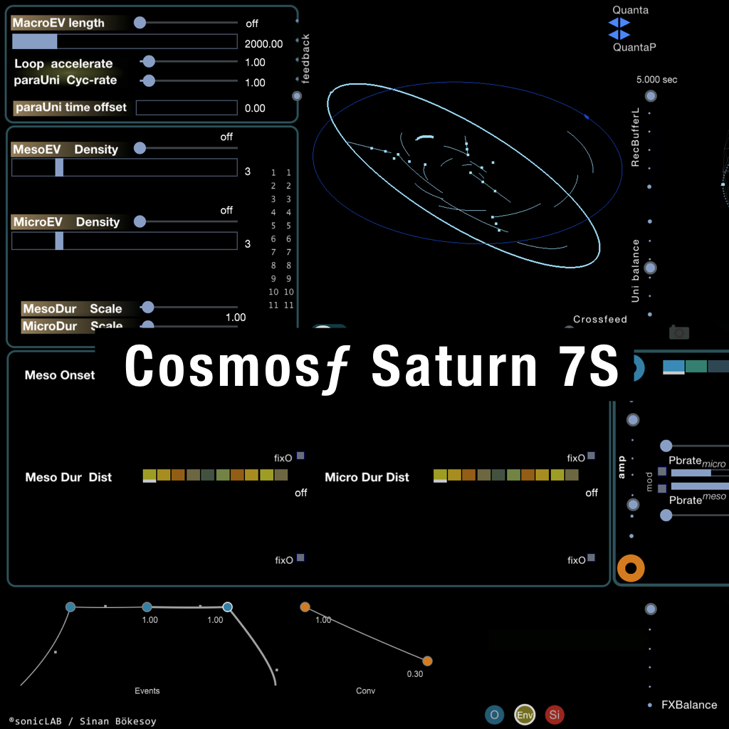Cosmos is a dynamic mechanism of real-time stochastic synthesis, which generates complex sound textures with various event distribution processes.
